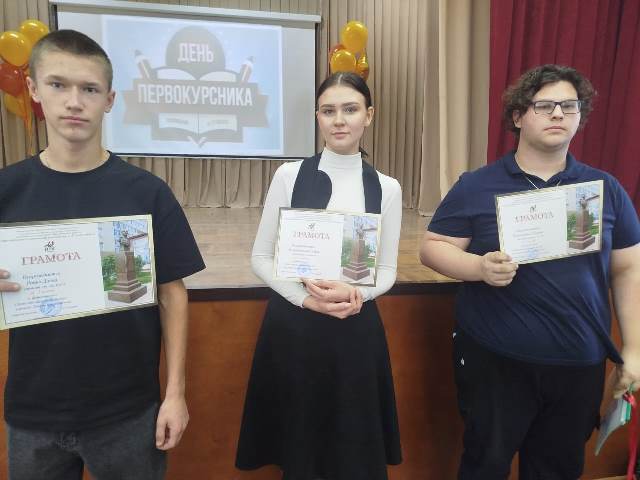 Поздравила первокурсников с их праздником заместитель директора по учебно–воспитательной работе Степанова Елена Владимировна, вручив самым активным грамоты за победы в конкурсах: чтецов, фото и видео работ, а также благодарственные письма за гуманитарную помощь бойцам СВО. Старшекурсники-члены студенческого Совета вручили старостам 1 курса «Паспорта групп».