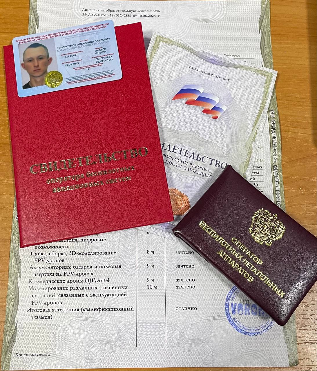 Мастер производственного обучения Сорокоумов А.П. прошел обучение и получил свидетельство о профессии рабочего, должности служащего по программе «Оператор беспилотных авиационный систем (с максимальной взлетной массой 30 килограмм и менее)».