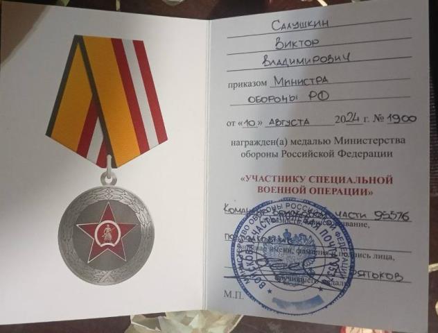 В этом году, накануне дня Защитника Отечества, Приказом министра обороны РФ Виктор Владимирович Салушкин был награжден медалью Суворова за личное мужество и отвагу, проявленные при защите Отечества и государственных интересов Российской Федерации. А несколько дней назад из рук командования он получил сразу две награды: медаль «За боевые отличия» - за заслуги, проявленные в боевых условиях и при проведении специальных операций в условиях, сопряжённых с риском для жизни; медаль «Участнику специальной военной операции».