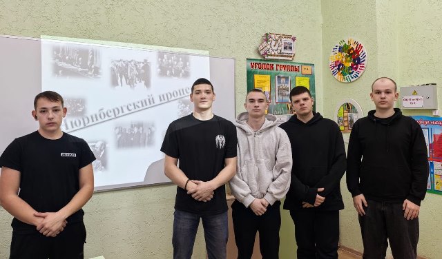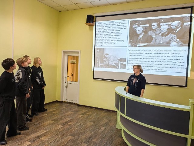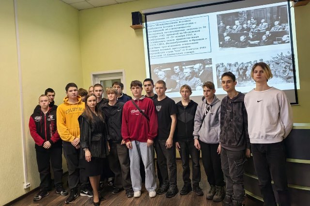 К этой памятной дате педагогом-организатором колледжа Ольгой Андреевной Погребняк 21 ноября 2025 года был проведен урок мужества «День начала Нюрнбергского процесса». В ходе урока обучающиеся ознакомились с историей Нюрнбергского процесса, его значением для мирового правосудия.