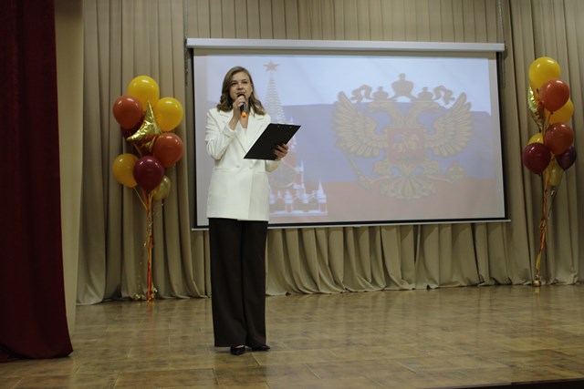 Знаменная группа имени выпускника колледжа Хамкова Дениса Васильевича, Кавалера ордена Мужества внесла Государственный флаг РФ. Прозвучал Гимн Российской Федерации. Для хорошего настроения и уверенности в себе для гостей вокальный ансамбль «Полет» исполнил песню.