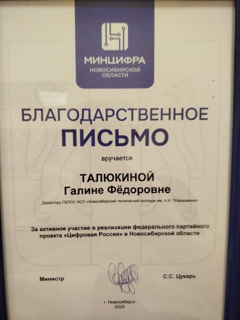 В завершении заседания Отраслевого совета руководителям колледжей, которые активно участвовали в реализации федерального партийного проекта «Цифровая Россия» в Новосибирской области были вручены Благодарственные письма Министерства цифрового развития и связи Новосибирской области. Среди награжденных была директор Новосибирского технического колледжа им. А.И.Покрышкина Галина Федоровна Талюкина.