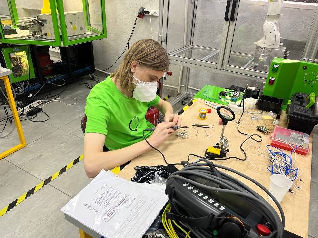 На площадке «Монтаж и обслуживание промышленных роботов» соревнуется 5 команд. В течение 3 конкурсных дней конкурсантом предстоит монтаж и обслуживание роботизированного технического комплекса. Задача конкурсантов – спроектировать комплект оборудования, произвести сборку РТК, произвести подключение пневматики и электроприборов, создать тестовую программу для проверки всего периферийного оборудования. В первый конкурсный день конкурсанты выполняют 5 модулей и производят его настройку.