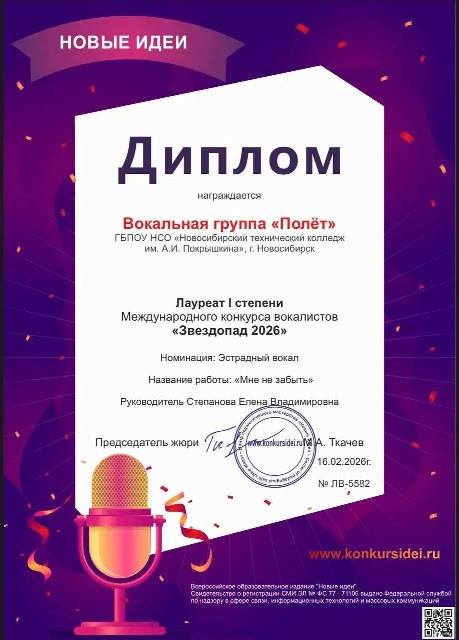 Участники вокального ансамбля «Полёт» Новосибирского технического колледжа им. А. И. Покрышкина приняли участие в Международном конкурсе вокалистов «Звездопад-2026» в номинации «Эстрадный вокал». Диплом лауреата 1 степени стал заслуженной наградой наших ребят.