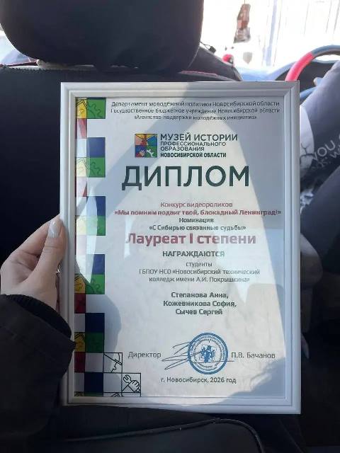 Конкурс был организован Агентством поддержки молодежных инициатив и проводился в целях сохранения исторического наследия о Великой Отечественной войне о блокаде Ленинграда. От нашего колледжа на награждении присутствовали: председатель студенческого Совета колледжа Леонид Голдаев и участники медиацентра колледжа "Образ": Кожевникова София и Сычев Сергей. Свой видеоролик ребята посвятили учащимся профессиональных училищ эвакуированных из блокадного Ленинграда в Новосибирск. В номинации "С Сибирью связанные судьбы" наши ребята стали Лауреатами 1 степени. Это уже не первая победа нашего медиацентра в подобных конкурсах. Пожелаем ребятам дальнейших успехов!