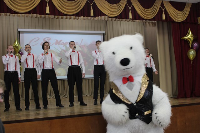 Студенческий Совет вместе с вокальным ансамблем «Полет» и агитбригадой «Надежда» подготовили праздничные поздравления. Творческие номера были торжественными, весёлыми и музыкальными. Каждый номер настоящим подарком для зрителей. Всем женщинам и девушкам: преподавателям, сотрудникам и студенткам были посвящены теплые слова поздравления, прозвучавшие из уст представителей сильной половины колледжа. Ведущие торжества: Анна Витальевна Степанова и Александр Павлович Сорокоумов в течение всего концерта одаривали прекрасную половину колледжа трогательными стихотворными строчками и теплыми поздравлениями. Зал встречал каждое выступление бурными аплодисментами. Украшением концерта стал видеоролик с поздравлениями от мужчин – преподавателей и студентов. Кульминацией концерта стало появление огромного белого медведя, который пришел поздравить виновниц торжества. А старосты групп преподнесли всем женщинам букеты цветов. Зрители были в восторге от концерта. Это было видно по их глазам и улыбкам на лицах.