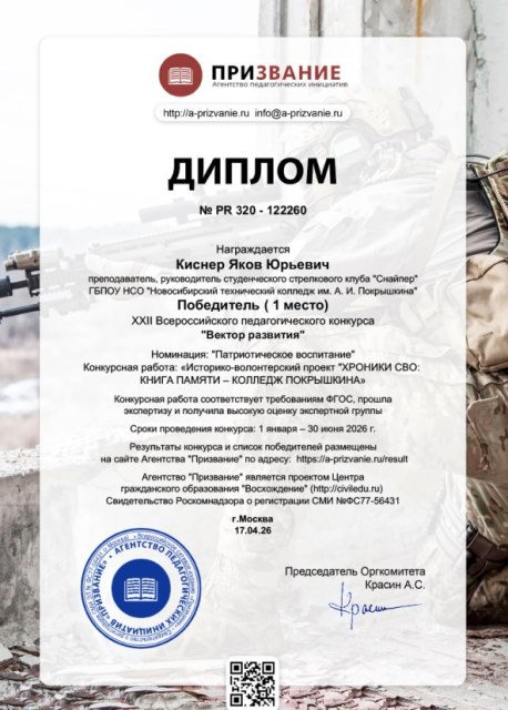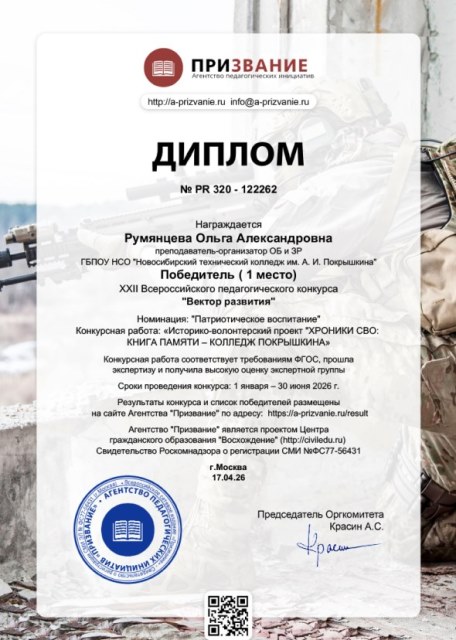 Педагоги колледжа приняли участие во Всероссийском профессиональном конкурсе педагогического мастерства «Вектор Развития» с проектами «Дневник в будущее. Письмо в прошлое» и «Хроники СВО: КНИГА ПАМЯТИ – КОЛЛЕДЖ ПОКРЫШКИНА» в номинациях: «Патриотическое воспитание» и «Авторские программы», оба проекта получили высокую оценку жюри, документы о соответствии ФГОС.