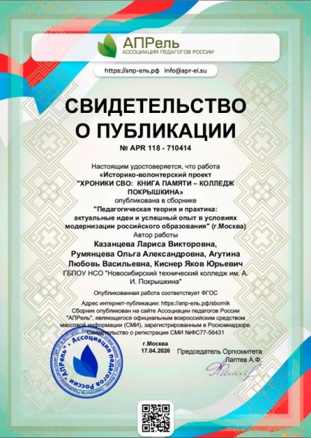 Проект «Хроники СВО: КНИГА ПАМЯТИ – КОЛЛЕДЖ ПОКРЫШКИНА» разработан осенью 2024 года, имеет несколько направлений работы. Авторы проекта, педагоги колледжа: Румянцева О. А., Казанцева Л. В., Киснер Я. Ю., Агутина Л. В..