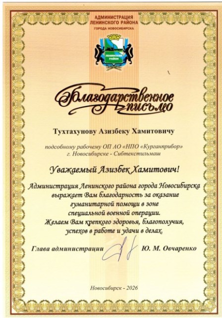 Маловик Егор и Тухтахунов Азизбек – студенты группы СВ-314 «Сварочное производство», под руководством куратора Румянцевой Ольги Александровны в составе военно-патриотического клуба «Крылатая гвардия» в течение полутора лет активно занимаются волонтерской деятельностью сотрудничая с движением «Комсомольцы фронту»: плетение сетей, в том числе, и на территории колледжа, набивка матрасов для штурмовиков, сбор гуманитарной помощи. На сегодняшний день парни проходят производственную практику на АО «НПО «Курганприбор». По инициативе администрации предприятия и руководства колледжа ребята были награждены Благодарственными письмами администрации Ленинского района за оказание помощи в зоне специальной военной операции!