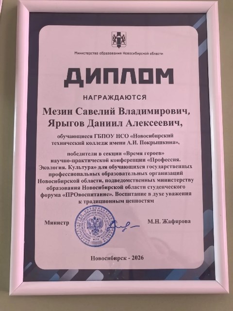Мезин Савелий и Ярыгов Даниил, студенты группы С – 114, награждены дипломом победителей научно-практической конференции «Профессия. Экология. Культура», (секция «Время героев»).