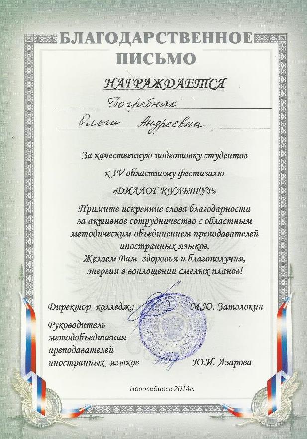 Члены жюри оценили работу преподавателя иностранного языка Ольги Андреевны Погребняк, наградив ее благодарственным письмом за качественную подготовку студентов к 4 областному фестивалю «Диалог культур».