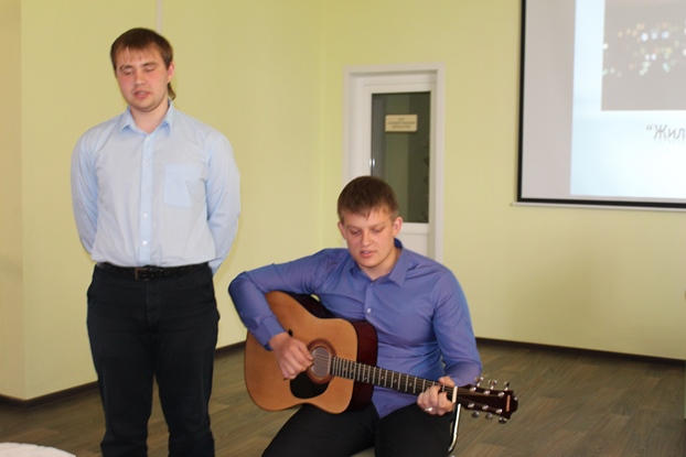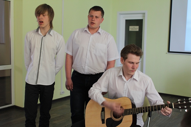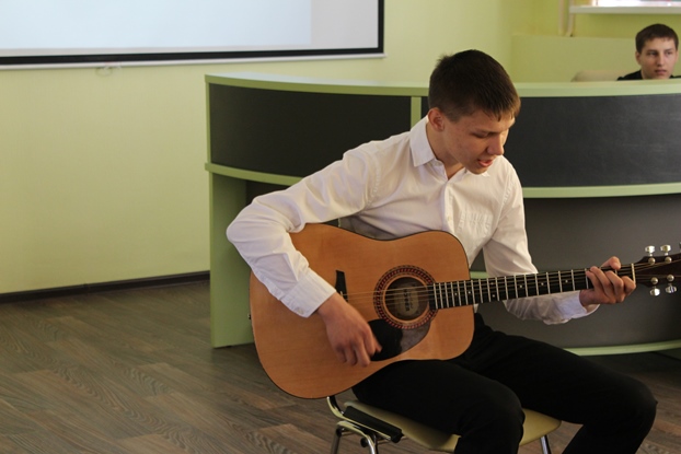Ведущие мероприятия Ольга Александровна Съедина и Карина Емец (гр. К-141) пригласили гостей литературно-музыкальной гостиной в красивый мир песен и стихов о любви. «Я давно хотел сказать, что я тебя люблю…», «Я куплю тебе новую жизнь», «Когда твоя девушка больна», « Я могу тебя очень ждать…» и многие другие композиции не оставили равнодушными ни одного слушателя. А исполнили их студенты-электрики: Денис Крамаренко, Дмитрий Добурдаев – гр. Э-221, Илья Хатин, Александр Чухно, Влад Цыпкин, Евгений Игнатенко, Никита Шпатак – гр. Э-121. Александр Крамаренко подготовил мультимедийную презентацию, которая прекрасно дополняла музыкальное выступление ребят.