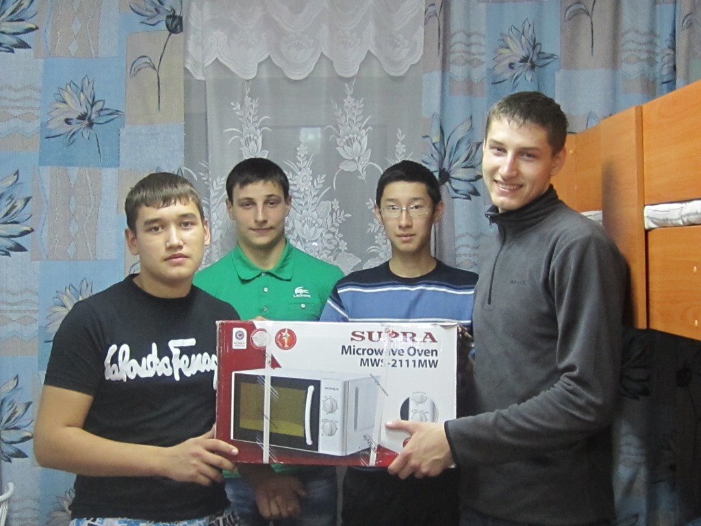 Конкурс на выявление самой чистой и уютной комнаты месяца в общежитии продолжается. В октябре число студентов, желающих победить, заметно увеличилось. Но конкурс есть конкурс, и при подведении итогов победители определены – студенты первого курса М-151: Шевчишин Стас и Утельбаев Роман и второкурсник (ТГ-291) Амангельды Асет. Именно они стали счастливыми обладателями новой микроволновой печи, о которой мечтали давно. На общем собрании староста общежития Александр Крамаренко вручил победителям заслуженный приз.
