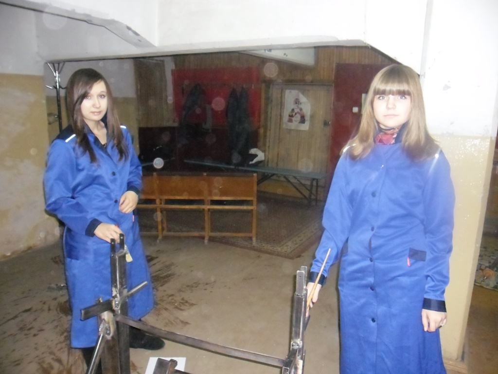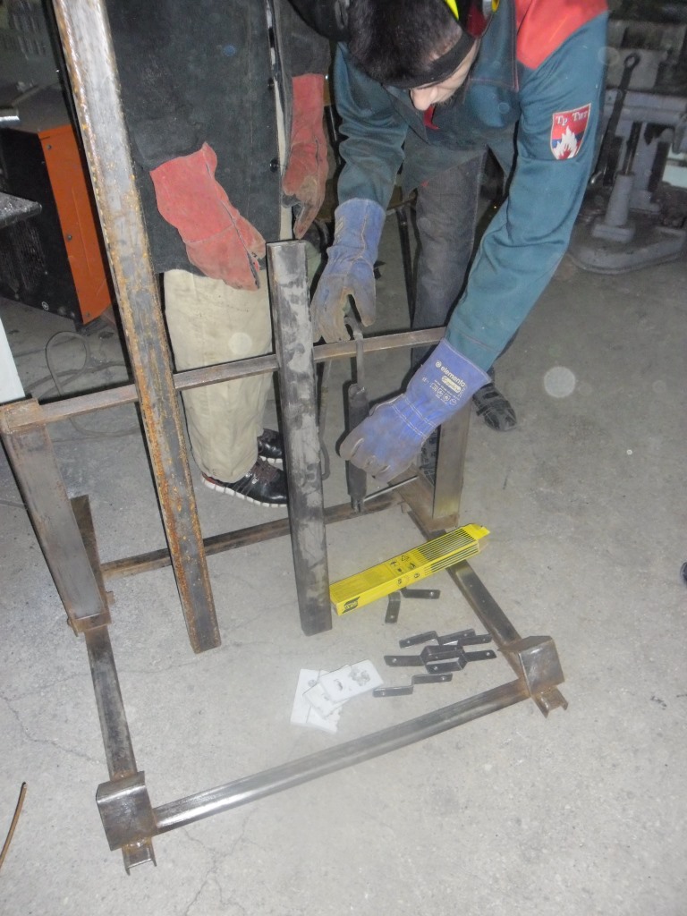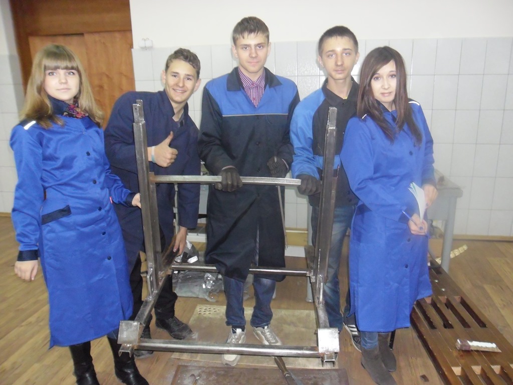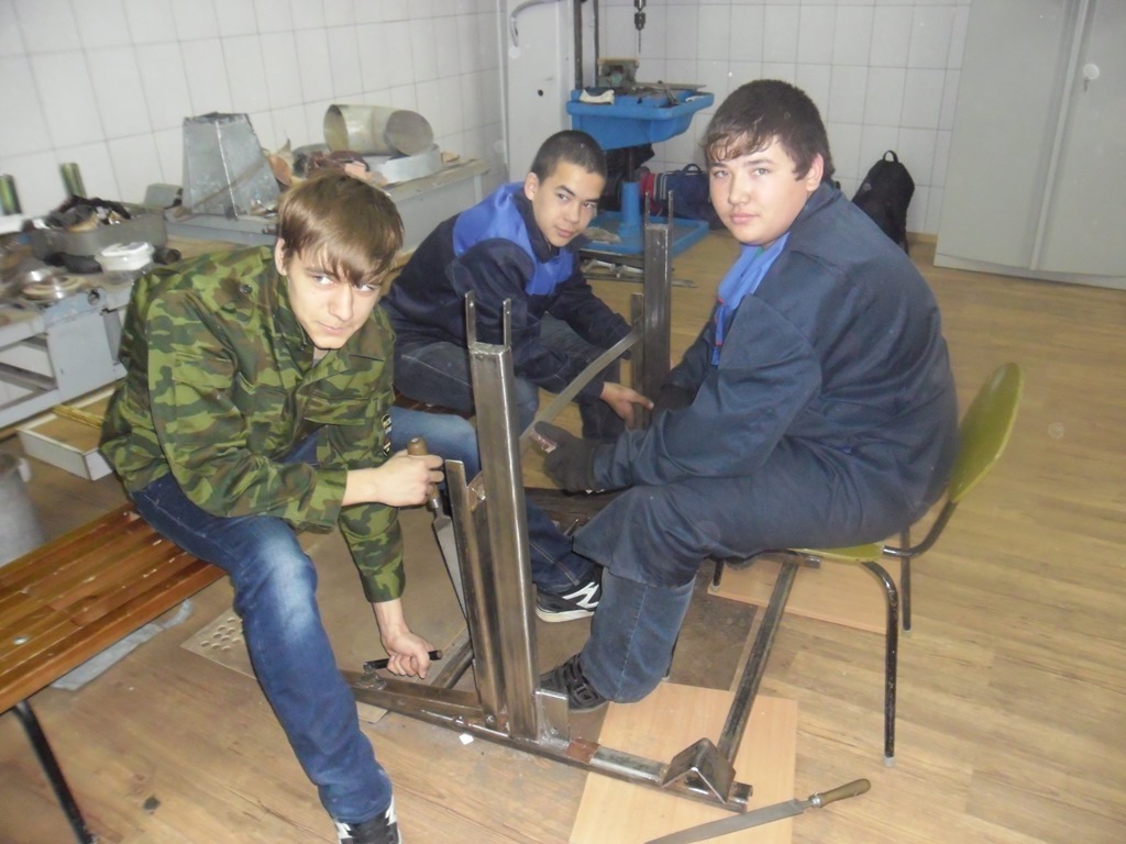 Анатолий Анатольевич проявил инициативу в создании проекта, у него возникла идея творческого подхода к организации учебной практики, а именно: создавать что- то полезное для самих студентов, для колледжа. Совместно с мастером производственного обучения Романом Михайловичем Малаховым были организованы студенты групп: С- 111, С – 112. У заместителя директора по производству Синекова Сергея Петровича ребята взяли остатки «делового» металла и электроды. «На хорошее дело» - сказал он, - «не жалко!» В глаза попалась старая советская ржавая металлоконструкция непонятного назначения, в которой студенты разглядели заготовку для стойки. Затем возникла идея- изготовить несколько тренажеров для спортивного зала, в которых нуждаются преподаватели физической культуры и сами студенты нашего колледжа. Так, воодушевившись идеей, студенты разработали тренажер, и за две недели вместе с Романом Михайловичем изготовили его. Студентам групп С-111, С – 112 очень пригодились слесарные навыки. Ребята сначала долго очищали станину от ржавчины, затем вырезали из разного профиля необходимые детали и сваривали их ручной дуговой сваркой. Для контроля процесса сварочных работ было решено привлечь контролеров группы К – 341 (куратор Погребняк Ольга Андреевна). Пономарева Кристина и Сурдал Даша в процессе изготовления стойки нарисовали технический рисунок для дальнейшего перевода в Cad систему «Компас» и технического оформления, затем занялись покрасочными работами. Получилась стойка для упражнений со штангой. На ней предусмотрены подставки под штанги и блины.