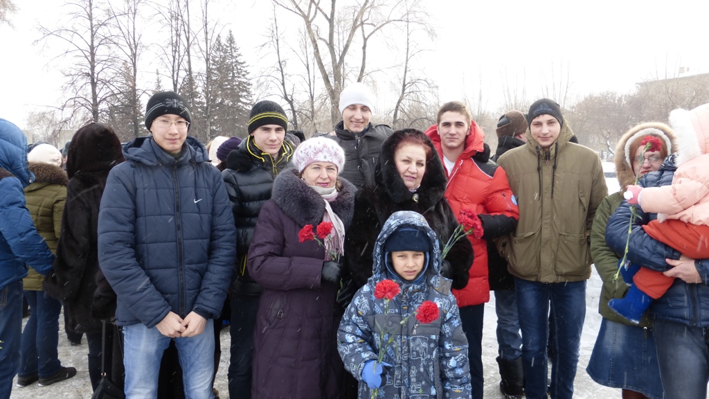 Многолюдно и пестро… Ветераны, военные, полиция, курсанты, студенты, преподаватели, школьники, мужчины, женщины, дети... Сначала все стоят отдельными небольшими группами, потом собираются в колонну и направляются к Вечному Огню Монумента Славы. Несколько выстрелов пронзает морозный воздух – дань Памяти павшим воинам-сибирякам, традиционно от Почетного караула… Неторопливо, с осознанием торжественности и грусти момента идет возложение цветов.