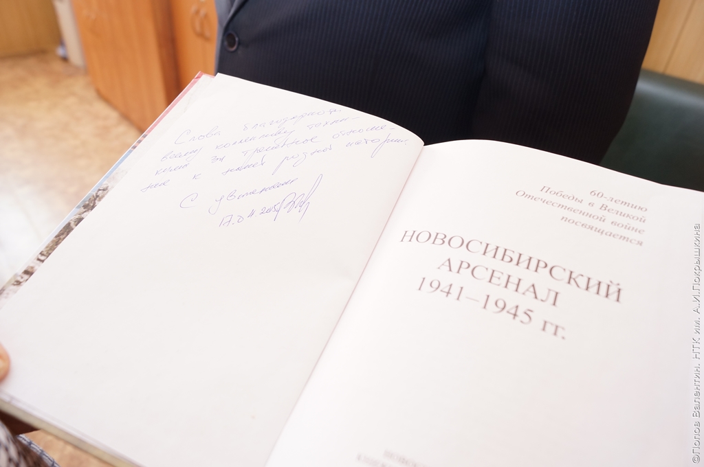 Выслушав доклады старшего мастера Анатолия Анатольевича Козлова и студентов, принимавших участие в реставрационных работах, Губернатор еще раз поблагодарил всех причастных к этому незаурядному проекту и оставил памятную запись в книге «Новосибирский Арсенал 1941-1945». Книга была издана в 2005 году при поддержке Владимира Филипповича бывшего тогда на посту мэра Новосибирска: